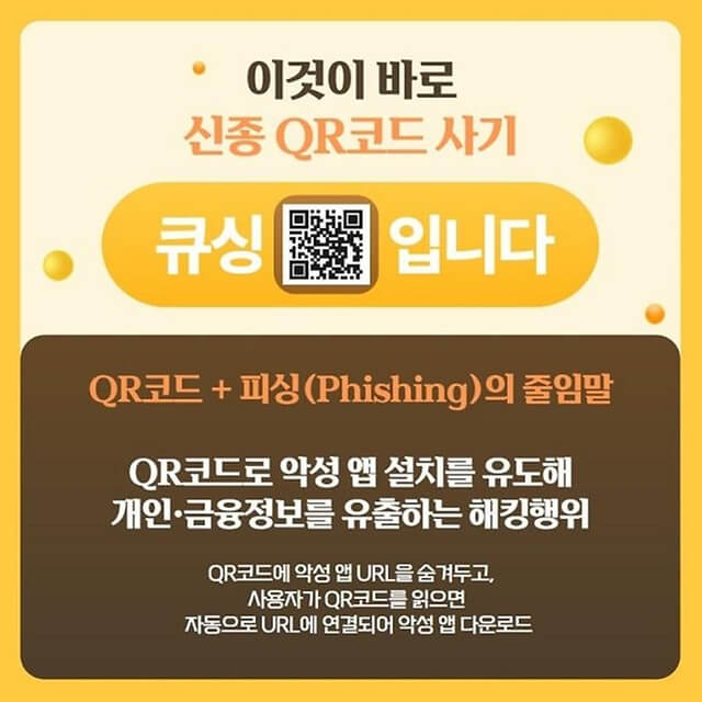 QR코드와 피싱(Phishing)의 합성어로, QR코드를 이용한 해킹을 의미합니다. 해커가 만든 악성 QR코드를 스마트폰으로 촬영하면 악성 앱을 다운로드하거나 악성 프로그램을 설치하도록 유도하는 행위를 말합니다.